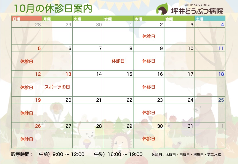 2025年10月1日 / 最終更新日 : 2025年10月1日 坪井どうぶつ病院 お知らせ 10月の診療日案内 10月の臨時休診日はありません。朝晩は肌寒いくらいの日もありエアコンがなくても寝れる日になり秋らしくなってきました。ワンちゃんのお散歩もだいぶ行きやすくなりましたね。寒暖差が激しくなっているので人も動物も体調を崩しやすい時期です。気をつけてください。また夏場に少し落ち着いていた鍼治療(東洋医学)のご予約が混み合っています。ご検討されている方はお早めの予約をおすすめします。