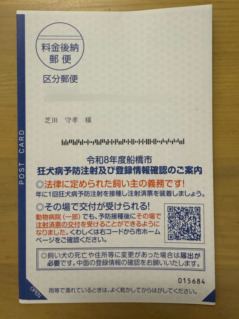 船橋市の方で注射済票交付(市への登録)の代行を当院に依頼される方は船橋市から届いているハガキ「令和5年度 狂犬病予防注射(集合)実施及び登録情報確認のご案内」をお持ちください。(紛失した等、ハガキがない場合でも接種および代行は可能です。)それ以外の方は不要です。