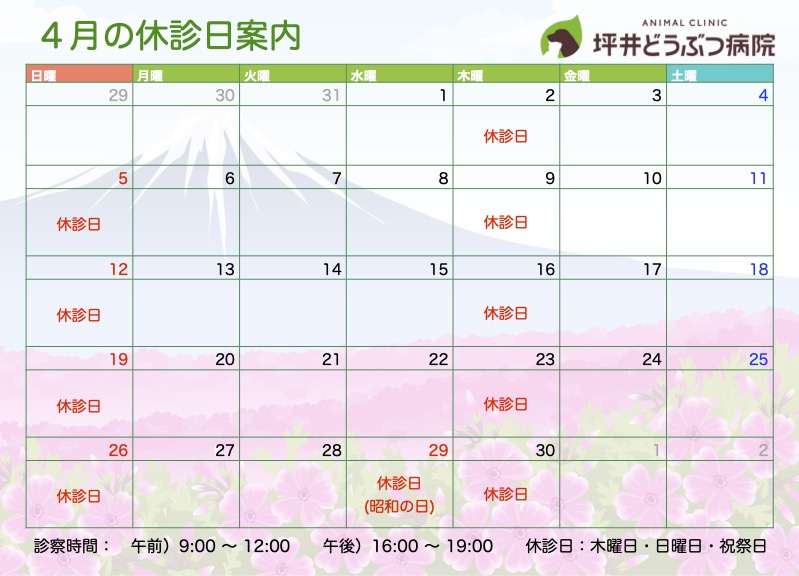 2026年4月1日 / 最終更新日 : 2026年4月1日 坪井どうぶつ病院 お知らせ 4月の診療日案内 4月は臨時休診日はありません。木・日・祝は休診です。予防シーズンになりました。狂犬病については各市町村からおハガキが届いていると思います。病院からも先日ご案内のおハガキを送らせていただきました。大切な家族を守るためにもしっかりと予防しましょう。なお、狂犬病をふくむ予防接種については予約不要です。この時期は病院も混雑することがありますのでお時間に余裕を持ってお越しください。